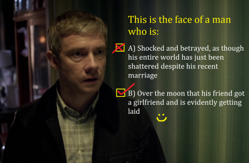 It’s the same thing when Sherlock essentially martyrs himself for John’s sake in saving Mary from Magnussen’s threat of blackmail. She stands by and calmly lets him take his punishment - death within six months in Serbia - and the thought of thanking him for what he did for her (for John, really) never even crosses her mind. She doesn’t even send him off with wishes for his safety and speedy return. Oh no - what she does is remind him that she’ll be the one there with John, keeping him “in trouble”, which is about as subtle as her “but it’s my wedding day!” line in The Sign of Three. Sherlock gives up his entire life for them (John) and Mary blithely accepts his sacrifice as something that was owed to her and doesn’t merit so much as a thank you.