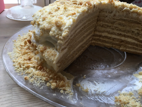 I did say I would bake the 8-layer honey cake when @silentauroriamthereal finishes writing Sonatina in G Minor. The fic is done and I have cake, so it’s time for another round of ‘eating and reading’. Last night it was a bit of ‘boozing and baking’ as I happened to have a really nice shiraz. It’s a miracle I didn’t make a mess of the cake after a couple of glasses.