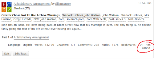 Oh goodness! I’m on the road until tomorrow, but I just saw that my story A Satisfactory Arrangement has reached 20,000 hits! It’s my 12th of 61 stories to reach this milestone and I’m delighted! Thank you so much for reading it and giving it love!