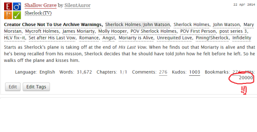 Omg yay! My story Shallow Grave just reached 20,000 hits today! This was the only fix-it I wrote (until The Battle for John H. Watson) in which Moriarty was actually alive. It starts with Sherlock walking off the plane and kissing John, in front of Mary and Mycroft, which makes things rather awkward for awhile. It’s one of my rarer first person POVs (Sherlock). Thanks for reading this one and giving it love! It’s the 11th of my 61 stories to have reached 20K hits. :)