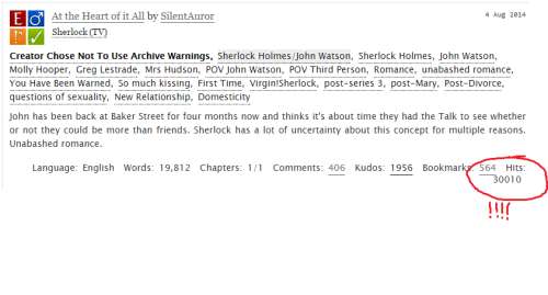 My story At the Heart of it All just reached 30,000 hits as of this morning! Wow, thanks, you guys!!! One of my favourite ever things that anyone’s said about a story of mine was said about this story, and I’m terribly sorry that I’ve forgotten who said it, but when it was originally posted here on tumblr, someone reblogged it with the comment “Bury me with this fic” and I loved that so much! This story is one of the ones that’s particularly close to my heart. It also comes with the only story I’ve ever written wherein I probably cried from start to finish in the writing of it, The Final Proof. It’s not linked as a sequel because I wanted to make sure people read the warnings first (!!!!), but it’s definitely the sequel! This is the fifth of my sixty Sherlock stories to reach 30K hits and I’m delighted! Thank you so much for reading this story and giving it love!