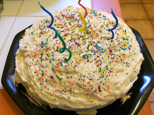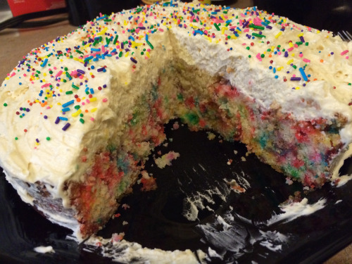 Just sharing a pic of a cake I made last week for my buddy’s birthday. :) When I asked him what kind of cake he likes, the first one he said was funfetti, which I had never really heard of. What I did think was that it was probably a box mix, and I was right, and I was not about to make my friend a box mix cake for his birthday! So I googled recipes, found this one (long-winded explanation at the beginning but it’s so good!!) and used it, and it worked out perrrrfectly. I mean, it’s obviously very homemade-looking, but it was so f’ing good! I would eat this cake every day if I cook. Seriously. It was even better the second and third days! I didn’t have brown sugar and used all white, and it was fine. I used vanilla Greek yogurt. If you like baking, try this!!