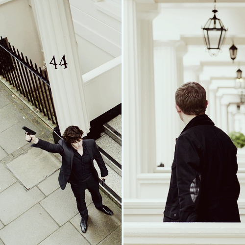 Sherlock is SO attractive in this shot! The downward shot, the raised arm, the 183cm of sex in all black, the open vee of pale skin, the loosely-tousled curls… it’s amazing that John didn’t “tackle” him again right there!