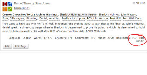 Whoa, thanks everyone!!! Best of Three exceeded 70,000 hits today! This is ground-breaking for me! It’s been fun having new people discover it lately because of that nice rec and the other recs that stemmed from it! This story has been the leader in my collection for hits (70K+), kudos (2,950) and bookmarks (968 public, 1,286 including private). It’s rather mind-boggling, but so encouraging especially the night before I’m about to post a new fic! You guys are the best, thank you for reading this so much and giving it love!
