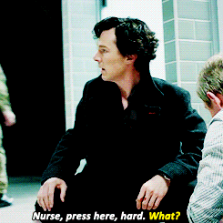 One of the things I love most about their dynamic is that they bicker and they object, but they always do what the other tells him to do. John rolls his eyes and grouses and yet still comes to get Sherlock’s phone out of his shirt pocket for him. Sherlock makes the indignant face in the second gif here, yet his hand is already on the wound giving pressure, as John told him. They listen to each other. They bicker, but they respect each other enough that they also listen to each other and take the other’s directions without question. The questioning is really only for show. I love that. :)