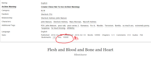 Ahhh, omg yay! My newest story, Flesh and Blood and Bone and Heart, just reached 10,000 hits tonight!! That’s really exciting - it’s been up for five weeks now and it’s still in my head all the time. This is the thirty-second of my fifty-eight stories to have hit 10K now. Crazy! Thank you for reading it and giving it love!