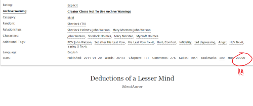Eeee!!! Deductions of a Lesser Mind, aka my first and also the fandom’s first post-HLV fix-it fic, just reached 20,000 hits today!!!