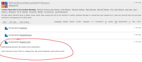 Stuff that deals with the post-Reichenbach in-between time and the immediate aftermathAND YET. If you read through just a few of the comments on the last chapter, you’ll quickly see the sheer number of people saying “I don’t normally like this sort of thing, but WOW.” Believe those folks. Believe ME. Even if it’s not your thing, try it.