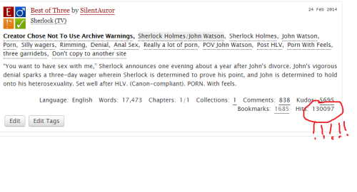 Oh WOW, this is very cool!! My fic Best of Three just attained 130,000 hits!!!! I just noticed! So, it’s been my habit to note fic milestones every 10,000 hits (if a fic gets that far, that is!), just to take a second to say thank you to all the people who have taken the time to read whichever story it is. That means that Best of Three has now celebrated THIRTEEN of these posts! It’s the only one of my stories to have exceeded 100,000 hits. It has 5,695 kudos as of right now, 838 comments (half of those would be my replies!), and 2,390 bookmarks (1,685 of which are public). It’s mind-blowing. As I always say, this silly little story was only ever meant to be a bit of borderline crack, meant to give my brain and heart a break from the plot-heavy, angst-heavy series 3 fix-it fics I was furiously writing at the time. I never expected it to become far and away my most popular story, and back then, it almost used to infuriate me, lol. Now I’m just grateful that so many people have read it and loved it and especially those of you who have taken the time to say so in your comments. It means so very much to me and I’m so pleased that so many of you have loved this one! Thank you so much!!!!!!!