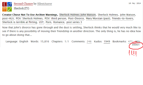 Omg omg omg!! My little story Second Chance just went over 30,000 hits this morning! This is enormously exciting for me! This is only my third story to have surpassed 30K, after Against the Rest of the World and Best of Three. Thank you so, so much for reading this story and giving it love! Awkwardly-trying-to-flirt Sherlock was a joy to write, plus getting to write a re-do of the stag night was fun, too! :) Thanks so much for this! I love you guys!