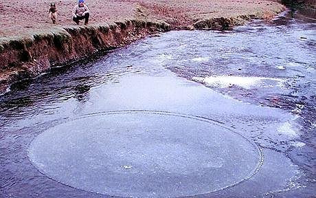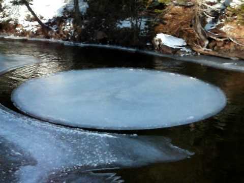 An ice circle is a natural phenomenon that occurs in slow moving water in cold climates. They are very rare and they rotate. They are formed when floating bits of ice get caught in an eddy (a whirlpool) and start spinning in a circle.