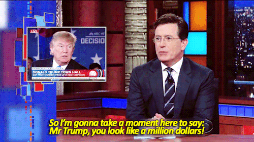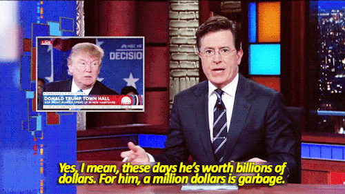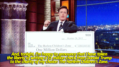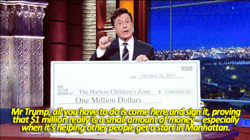 Jon Stewart, Stephen Colbert, and John Oliver (I mention them because they have their own shows, but I could mention a LOT of other people, particularly other pundits from Jon Stewart’s established tradition on The Daily Show, such as Jessica White, Larry Willmore, Samantha Bee, etc), are living proof of the power of politcal satire when deployed outstandingly. People tend to scoff at political satire and say that it’s easy to just poke fun from the sidelines but harder to actually do something that will change the system or politicians they’re calling out. But look at this! It’s hardly the first time that Stephen Colbert has spoken some serious truth to power, but here he’s using his position to pin Trump on this ridiculous statement that a million dollars isn’t a lot of money and using it as a lever to make him either look like a cad or else donate to somewhere really worthwhile. Bravo to these comedians who are so much more than just funny people!