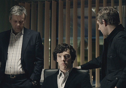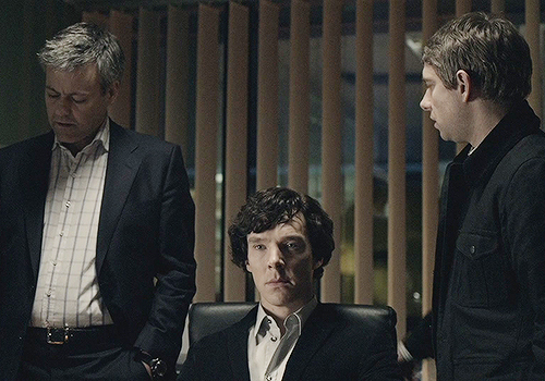 Don’t ever try convincing me that Sherlock never feels sorrow for the suffering of other people. It may or may not be his only priority, but that doesn’t mean that it isn’t one, or that he doesn’t care. Look at his face upon witnessing the old lady’s death over the phone. Look at both Lestrade and John’s reactions. Lestrade is looking away at first, then immediately turns in toward Sherlock. And John - John immediately moves closer and reaches for Sherlock, needing to touch him or, failing that, the nearest substitute. Don’t tell me that John squeezing the back of the chair here wasn’t meant to be Sherlock’s shoulders, a reassuring hand on the back of his neck. He just didn’t know whether that would be all right or not, whether it would be welcome. But he instinctively knew that Sherlock needed comfort here. And look at his face: he did.