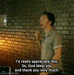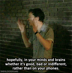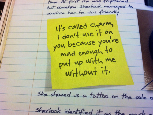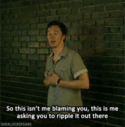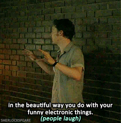 Although it’s also because John himself just stated that everyone, including him, thinks that he’s mad to put up with it. What I particularly like about this is that Sherlock also subtly reminds John that he isn’t even using his charm on him. And John already finds him charming when he’s being a dick (see the blog post after John watches Lestrade’s video, wherein Sherlock says that none of John’s friends like him - he finds THAT charming!). Imagine how much more charmed John would be if Sherlock really turned it on? :) (I’m not convinced that he completely knows how, but let’s say less about that for now.) :P