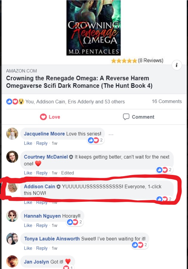 Since then, more authors have entered the MF Omegaverse and she has promoted them with genuine excitement that more people wanted to do MFO. One thing that I keep hearing over and over from the group of Indie Authors that I've gotten to know is that we all need to support each other. We can't write as fast as readers read, so having recommendations of similar work is GREAT for the in between times. Addison has embodied that. I don't know of a single author who DOESN'T feel like they can go to her at any time with a question or appeal for advice or to ask if they can post their newest release in her group. Just recently, I saw MD Pentacles post her most recent MF Omegaverse release in Addion's group.