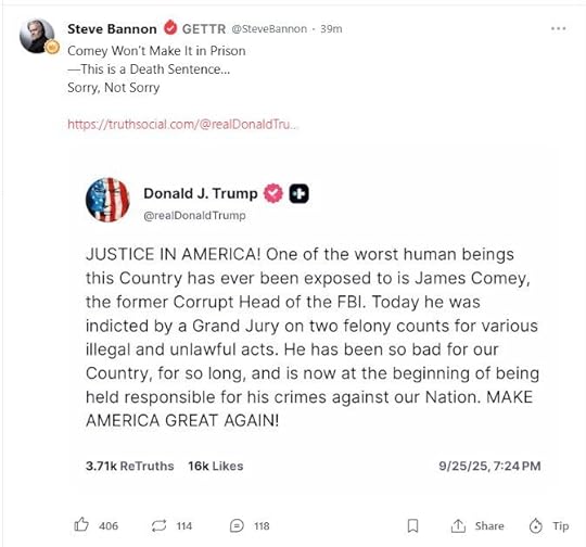To his credit, James Comey refrained from posting another death threat to President Trump following his arrest.