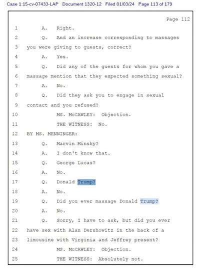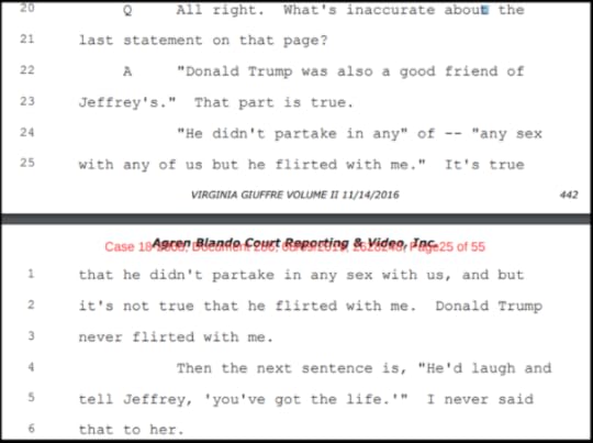 Following a 2011 article by journalist Sharon Churcher claiming that Donald Trump was a “good friend of Jeffrey’s,” Guiffre was asked to clarify Churcher’s possible misquote that “Donald Trump was also a good friend of Jeffrey’s,” and that Trump “Didn’t partake in any” of — “any sex with any of us but he flirted with me.”