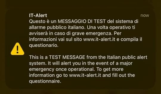 “This is a TEST MESSAGE from the Italian public alert system. It will alert you in the event of a major emergency once operational. To get more information go to www.it-alert.it and fill out the questionnaire,” the alert reads.