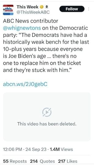 A video clip of Isgur’s remarks was posted with this caption, “ABC News contributor @whignewtons on the Democratic party: “The Democrats have had a historically weak bench for the last 10-plus years because everyone is Joe Biden’s age … there’s no one to replace him on the ticket and they’re stuck with him.”” The video was later deleted after criticism from Democrats and their supporters like Bill Kristol.