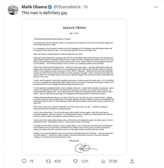 Malik Obama said his brother Barack Obama is “definitely gay” in response to the former president’s statement on banning porn books for children.
