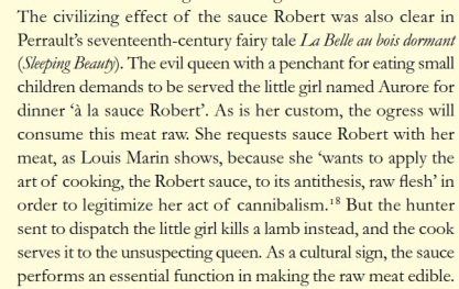 Como dato curioso, leyendo sobre salsas (en el libro Sauces de Maryann Teben de la excelente colección Edible de Reaktion books), aprendí que la famosa salsa Robert (hecha a partir de vino blanco y cebollas) se menciona como una forma de mitigar el canibalismo de la Reina en «La Bella durmiente» en la versión de Charles Perrault, ya que no estaría comiendo la carne cruda de la princesa.