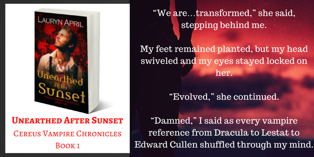 Vampires are a far cry from an original supernatural creature. They’ve existed in literature for centuries. So, how do you write about them and make them feel new? This was one of the biggest challenges I faced when writing Unearthed after Sunset. How to put your own twist on a story is a question writers tackle no matter what they’re writing about. There are no new plots, as they say. So, writers are constantly trying to create their own spin on things. With a vampire story, however, I feel like this is particularly difficult because if you twist too much then are you really writing about vampires anymore?