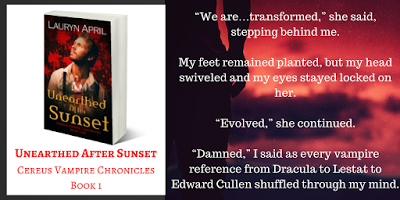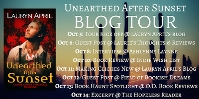 The blog tour for Unearthed After Sunset starts today! Follow the tour to read exclusive excerpts, book reviews, and guest posts all about my new urban fantasy vampire novel. The tour kicks off here with a little info about the book, and tomorrow it moves to Laurie's Thoughts and Reviews with a Song for a Scene guest post! I'm also doing a giveaway for a SIGNED PAPERBACK copy of the book.