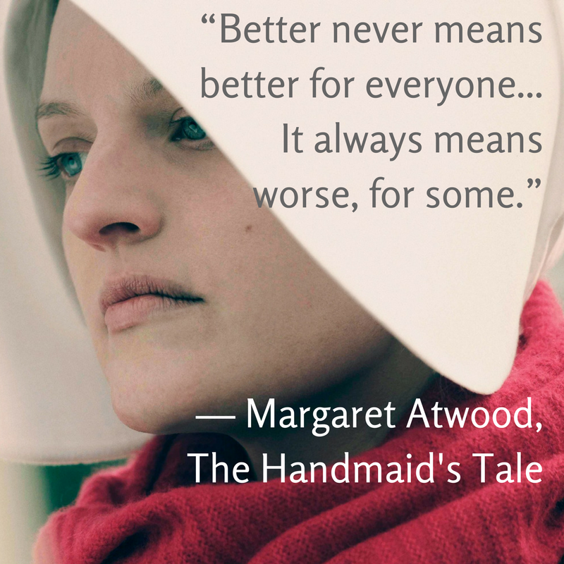 "Better never means better for everyone... It always means worse, for some." - Margaret Atwood, The Handmaid's Tale