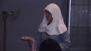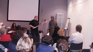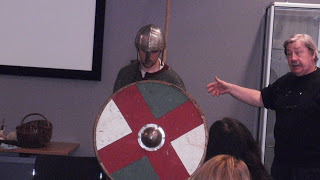 After Katrina had wowed the audience with her presentation, I spoke a bit more about the land division in Sussex and how the military system in 11thc England was linked to this. Then it was time for my young warrior, 'Esegar' AKA Adam Price to take centre stage. Esegar is Wulfhere's right hand man and shield bearer. He is a semi professional warrior and part time farmer, brought into military service by the one man for every 5 hide law. As a King's thegn, Wulfhere also owed military service. He and Esegar have been through much together having served in two major battles. As Wulfhere was unable to attend due to being on King's business, Esegar has come in his place to demonstrate the weapons used by the 11thc army.