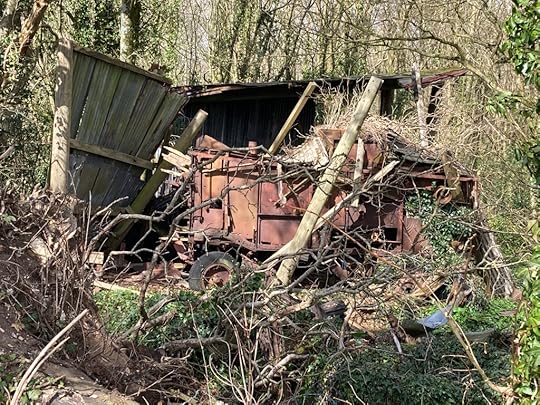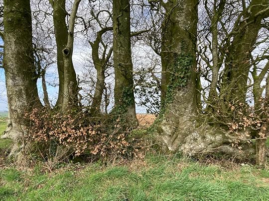 In other news, David and I achieved a long held ambition yesterday. The windows of our house look over water meadows to a ridge with a clump of trees. Setting off at ten o’clock, we stomped beside hedgerows and through fields to reach the trees ninety minutes later. They were not as we expected, with the evergreens hiding two huge water tanks but the deciduous tree with its many trunks and extensive roots was fascinating.