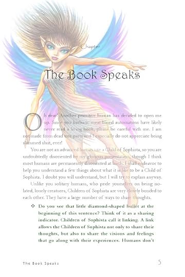 This mockup was created by the artist, Matt Curtis, using one of the pages from a draft layout and superimposing the background image, the fairy he drew. I originally came up with the idea for this book design by looking at what Brighter Books ([image error]http://www.brighterbooks.com/) had done with some of their books. They did lots of illustrations but the other neat thing they did was create a line drawing that went with the theme of the book. The unusual thing about the drawing was that they let the design go under the text on the chapter start pages and draw into the bleed area or the part of the book that might get trimmed. It gives the design a unique free form look where it is not curtailed by a fixed and visible margin. I knew I wanted to do something like that but I wanted to do it with a unique illustration designed for the book. I talked to my book designer about whether or not it was possible to do such a thing and he told me that it could be done and that it wouldn't cost that much. Since the book is scifi book that shows the origins of fairies and has as its metaphor, technology is magic, I knew I wanted to use a fairy illustration to balance out the scifi illustrations. Plus, in the early part of the serial where the book sounds more scifi-ish, I figured it would drive the readers bonkers wondering what was coming up in the book. It would cause them to anticipate the merging of fairy fantasy with science fiction. Anticipation is good. So the culmination of that idea was Matt producing a stunning "modern" fairy illustration for the background and then he did a mockup so I could see what my idea was really going to look like. The mockup was created with a draft layout page and isn't a real laid out book page. So the fonts will not be faded over the picture areas, etc., when the real page is produced. Take a look, see if you agree with my dream of how a book should look.