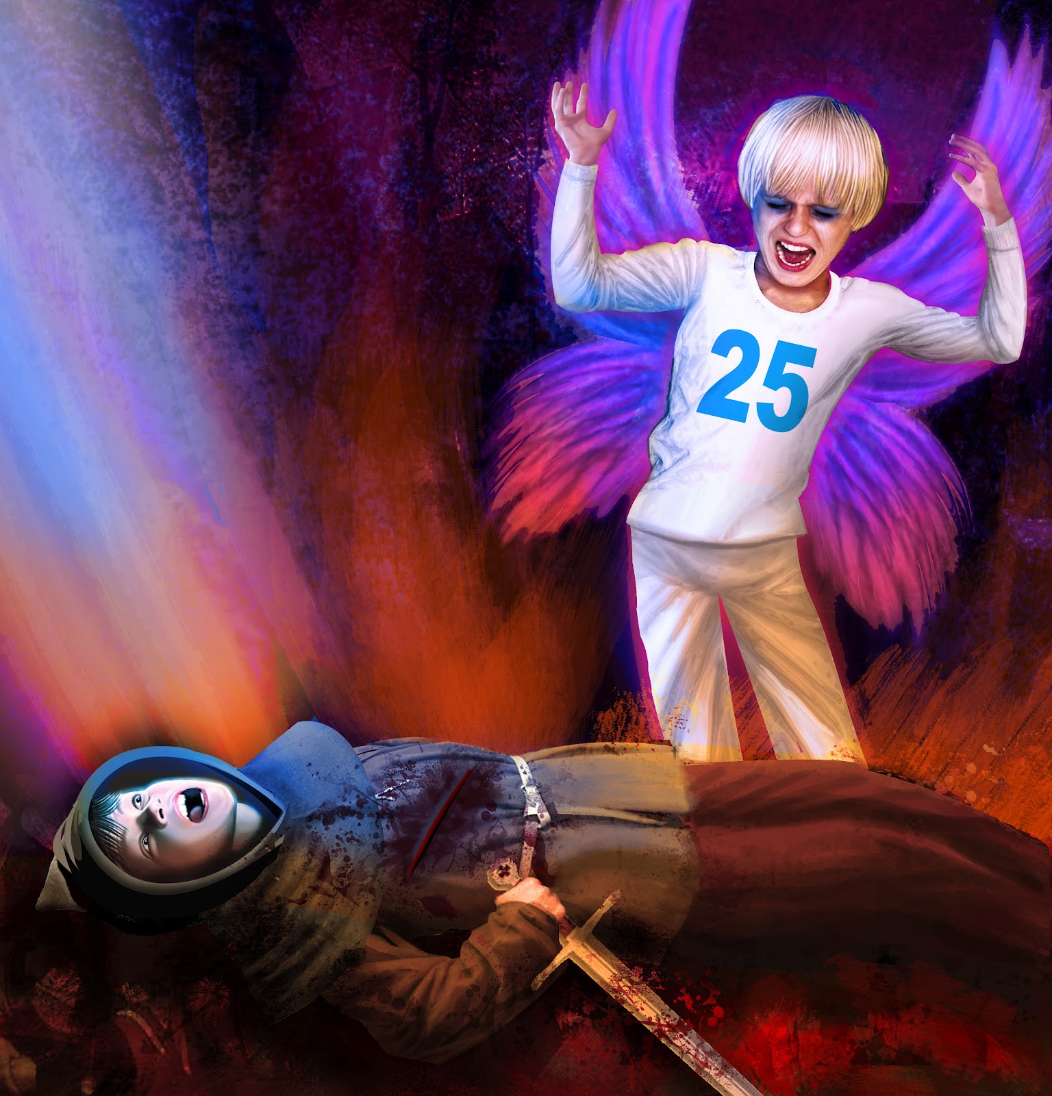 Paul25 from Sophista, whose age is frozen at 9 years old, is walking across a 15th century battle field and has just watched a peasant boy a die. He is upset because the boy should have never been in the battle and he was not allowed to heal the boy because Sophista didn't want to interfere with human evolution. The scene in the book is short because it is a flash back, but it is important because it is designed to make the fact that Paul25 has been alive for over 1000 years really tangible rather than a comic book fact. The idea is to make vivid in a reader's mind the huge number of horrible things in Earth's past that Paul25 has seen.