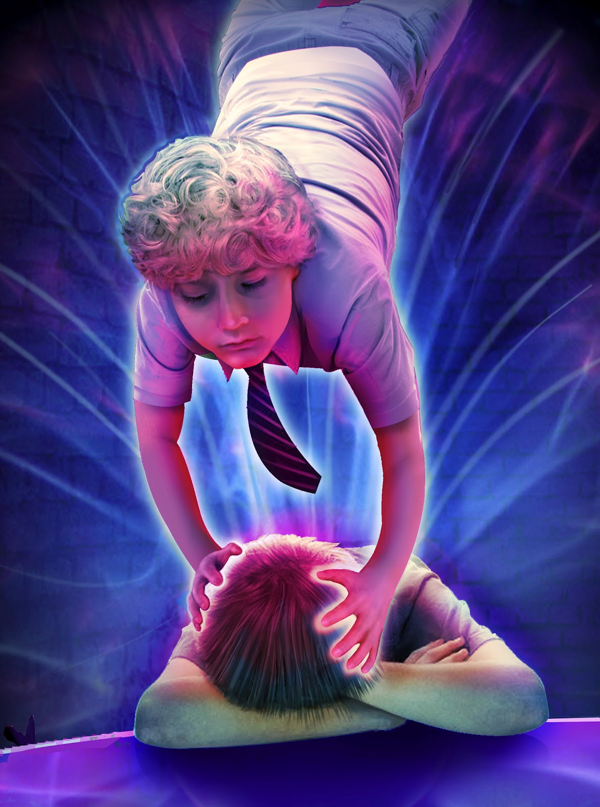 This is chapter 16's spot art created by my artist, Matt Curtis. Tyco is very upset, traumatized from finding out that the Lizards killed many Mayans in the process of manipulating their genes to lead to his creation. Ty is floating up in the air and connected to Tyco's mind with his hands to calm his hysterical crying and comfort him.