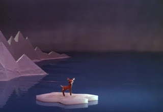 Top, Rudolph going away on an iceberg. Bottom, Buddy the Elf going away on an iceberg.Not to mention that other parts of the design were lovely as well -- the parts that had nothing to do with Rankin Bass. The Christmas decorations that Buddy the Elf provides wherever he goes are part of what make this movie so visually appealing.