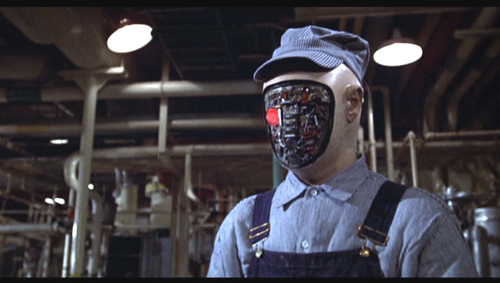 Peter Fonda's expression during 95% of this movie. The glasses didn't help.2. The story. Okay, I talked up "the sinister secret" of Futureworld in my description above -- but, really, about forty minutes into this 1 hour 40 minute movie I had already guessed "the sinister secret" -- and after that point, it was kind of slog to get to the ending. There were lots of scenes of our heroes running through pipe-filled corridors... and that's about all. The film left room for a few interesting twists... which didn't pay off. Characters got set up in the beginning of the film... and then disappeared and never had a resolution for their involvement (for instance, in the very beginning, they set up this obnoxious guy who won a game show and therefore gets to go to Futureworld. I assumed he would be murdered by robots at some point... but no, after one point where we get to see him debating which of the robots to have sex with, he's simply never seen again. Not as in, "he was killed by robots so we never saw him again" -- just, "He just wasn't important, so we didn't write any other stuff for him to do.") Also, there's a story involving one of the few remaining humans that work for the theme park. It seems he has a live-in robot buddy...