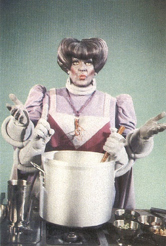 I will admit that I like the decoration esthetic at the Chewbacca family residence.They cook, they Skype some people, they watch TV, they put together Christmas presents. In the process, we run into such great Star Wars characters as... Trader Saun Dann! Ackmena the barmaid! And the ever-popular Chef Gourmanda!