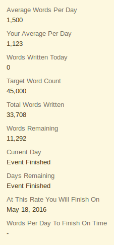 Ao começar o dia, sabia que faltavam 12528 palavras para completar o desafio. Não me esforcei tanto como ontem, porque sabia que era uma missão impossível, no entanto, também não quis baixar os braços. Então escrevi. Infelizmente não validei o último total de palavras que atingi: 34189, ficando o total oficial apenas nas 33708. Essas 1717 palavras serviram para completar dois capítulos e avançar outro quase a ponto de o terminar.