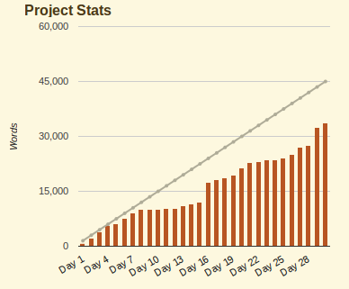 Quando cheguei ao vigésimo primeiro dia, decidi mudar alguns detalhes da história, acabando por entrar em contradição com o que tinha escrito antes. No dia seguinte, a minha produtividade voltou a descer, apesar de eu saber que precisava de aumentar para conseguir vencer o desafio. No Sábado, dia 23, escrevi muito pouco e no Domingo não escrevi nada. Olhando para trás, percebo que esses dois dias acabaram por ser o golpe final. Contudo, não desisti e continuei a escrever. Durante os dois dias seguinte, escrevi muito abaixo da meta pretendida. O vigésimo sétimo dia correu melhor, voltando a conseguir escrever acima da média, só para no dia seguinte ficar de novo aquém. O vigésimo nono dia foi o melhor em termos de prestação. No último dia, escrevi um total próximo da meta inicial.