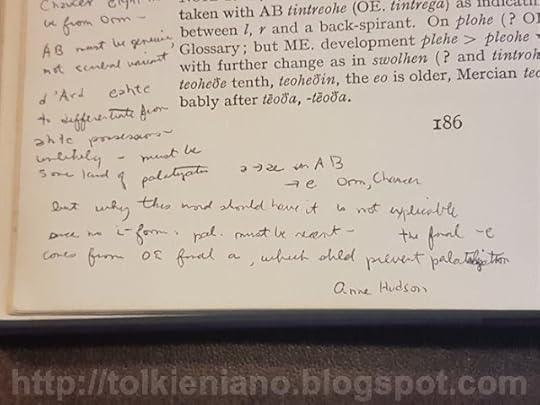 Annotazione 4/5Queste sono annotazioni in penna biro di colore nero. Ce ne sono diverse e tutte firmate alla fine Anne Hudson.Anne Hudson, è Professore Emerito di Inglese Medievale all’Università di Oxford e dal 1992 al 1995 è stata membro del Consiglio della British Academy. Specializzata in Medieval Studies e Central Europe medieval, è stata Lettore di Lingua e letteratura inglese al St. Hugh College di Oxford (1957-60) dove si è impegnata in una ricerca sulle fonti, la struttura e il dialetto della Cronaca Inglese di Roberto di Gloucester. Lettore all’Università di Oxford (1963-89), poi Fellow al Lady Margaret Hall, Oxford (1963 - 2003) e Professor of Medieval English all’Università di Oxford (1989 - 2003) di cui è, dal 2003 Emeritus Professor of Medieval English e Honorary Fellow al Lady Margaret Hall. Dalla fine del 1960 è impegnata negli studi sulla vita e gli scritti del teologo britannico John Wyclif e dei suoi seguaci, noti come lollardi (“seminatori di zizzania”) condotti sui manoscritti di testi latini e in inglese medievale, e curato diverse opere lollarde. Ha ottenuto il premio Sir Israel Gollancz dalla British Academy nel 1985 e nel 1991 e per molti anni ha collaborato con la Early English Text Society, divenendone infine direttore nel periodo 2007-14. Ha ottenuto un dottorato onorario dall'Università Carolinum di Praga nel 2010, e ha ricevuto due medaglie dalla Czech Academy. Negli ultimi anni è impegnata sulle copie della Bibbia Wycliffite, un gruppo di traduzioni della Bibbia in Medio inglese che sono state fatte sotto la direzione di John Wycliffe, un progetto sostenuto prima dalla fondazione Leverhulme e ora dall'Arts and Humanities Research Council. Tra le sue principali pubblicazioni, si citano: The premature Reformation. Wycliffite texts and Lollard history(1988); English Wycliffite sermons (5 voll., 1983-1996); The works of a Lollard preacher (2001); Studies in the Transmission of Wyclif's Writings (2008); Rolle's English Psalter Commentary and the related Canticles (3 voll., 2012-14) e Doctors in English: a Study of the Wycliffite Gospel Commentaries (2015). Nel 2013 ha curato il volume Probable Truth: Editing Medieval Texts from Britain in the Twenty-First Century assieme a Vincent Gillespie, quest’ultimo dal 2004 Tolkien Professor of English Literature and Language dell’Università di Oxford, la cattedra che porta il nome di Tolkien.