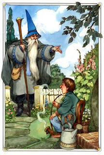 Gandalf di Alan LeeIl Consiglio si riunì a Gran Burrone, e Gandalf se ne stette seduto in disparte, silenzioso ma intento a fumare sfrenatamente (cosa che mai aveva fatto prima in occasioni del genere), mentre Saruman parlava contro di lui dicendo che non bisognava seguire il parere di Gandalf e lasciare ancora tranquillo Dol Goldur. Ma il silenzio e il fumo di Gandalf parvero irritare assai Saruman, il quale, prima che il Consiglio sciogliesse, disse a Mithrandir: “Qui si discute di cose di grande momento, e mi meraviglia alquanto che tu ti balocchi con il tuo fumo e fuoco, mentre altri fanno discorsi seri”. Ma Gandalf rise e replicò: “Non te ne meraviglieresti, se usassi tu stesso quest'erba. Costateresti allora che sbuffando fumo la tua mente si libera delle ombre che contiene. E comunque, ti permette di avere la pazienza necessaria per prestare orecchio senza irritarti a propositi senza senso”. Comunque, non è un mio balocco. Si tratta di un’arte dei Piccoletti che vivono laggiù all’Ovest: gente degna e allegra, anche se forse ha scarso peso nei tuoi alti disegni”. (p. 526)