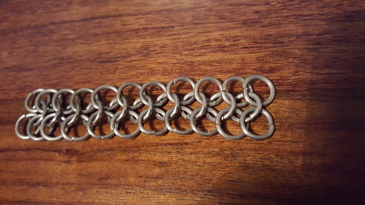 In this way you can easily create patches of maille ready to be joined together to make a larger item. Trust me, it's FAR easier working with small patches than adding row after row to a large, awkward and heavy shirt.