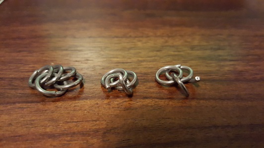 Notice that the middle ring has 4 rings though it. This is what we mean by European 4-in-1 maille, every ring should be joined to 4 others. There are many other kinds easily findable via web search, such as dragonscale maille.