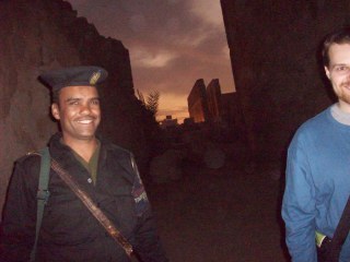 This became our first lesson in baksheesh, or tipping. The friendly guard, with his semi automatic strapped to his back, demanded in gestures that we pay up for the experience we had just had. We gave him our last two coins, having no small bills at this point, and there was a tense moment when he asked for more. Convinced that we didn’t have any more, he graciously allowed us to return to the well lit and highly populated areas of the temple, which we exited in a nervous rush.