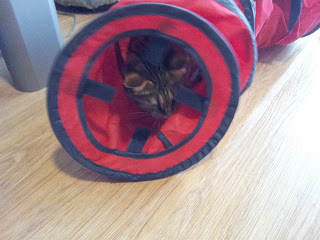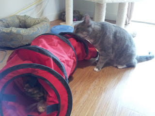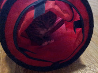 The cat has tunnel love today. It can sure be seen on display. There is no denying it at our sea. I am in the tunnel and not the cat tree. Cassie wants it though. I'll let her eat crow.