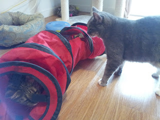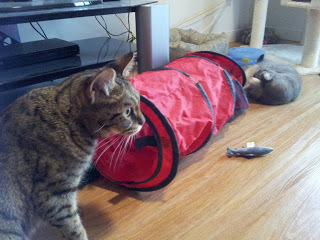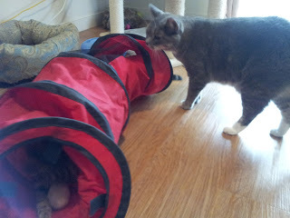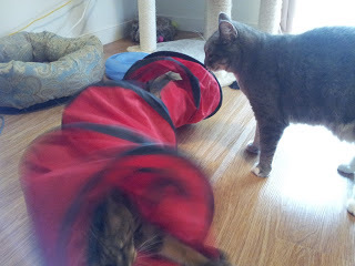 Ever get your tunnel stolen at your sea? It was not fun to me. I then went and grabbed the toy. She didn't fall for the same ploy. Hmph, cat house it is. I'm done with the tunnel biz. I'll leave that to Cass. I'm a sore losing little rhyming ass.