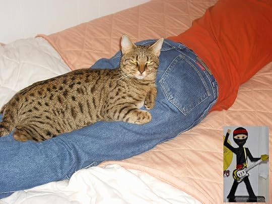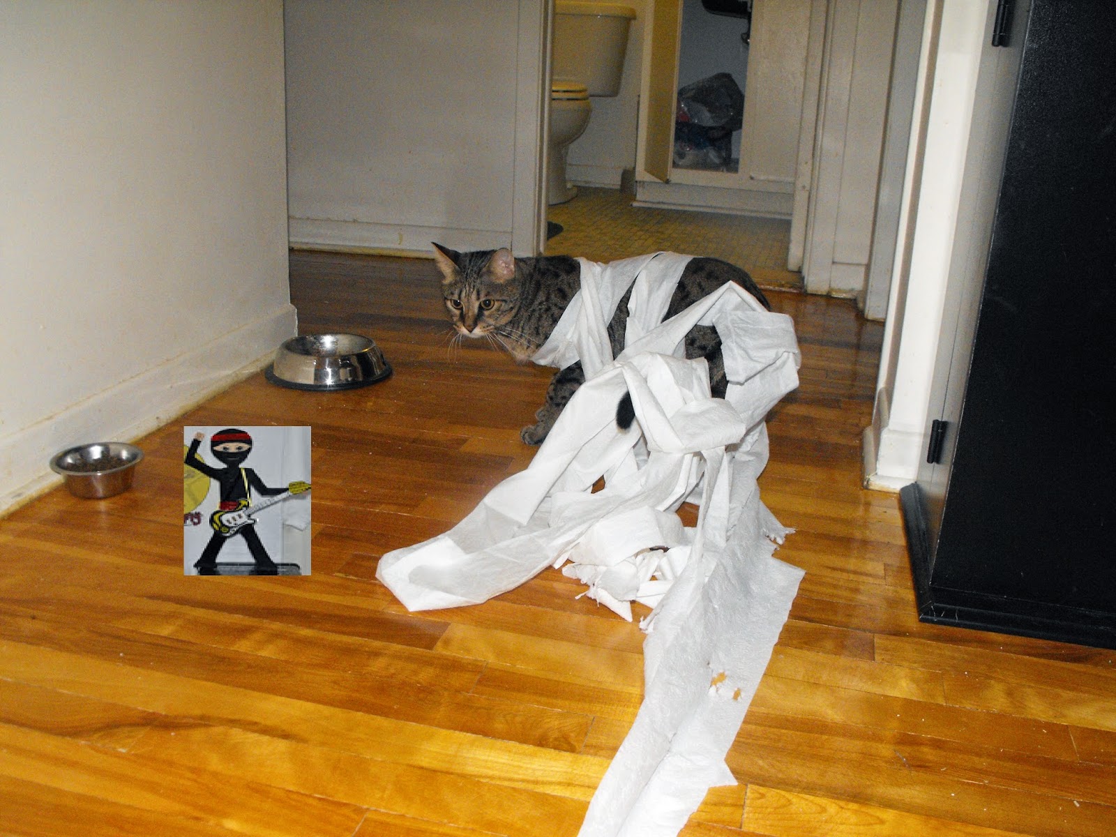 It seems Alex, aka the ninja wannabe, is after me. Maybe that litter smell won't come off mini him? That has to be kind of grim. The cat will just eat his ninja wannabe belt. Wait! Bad idea, my eyes may melt. Maybe just pelt him with cat hair. What am I going on about at my lair?