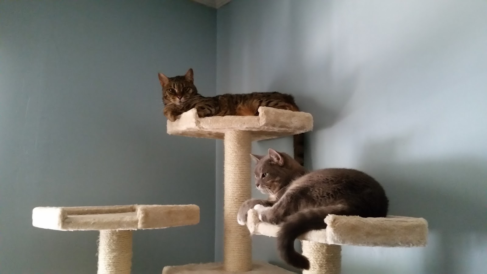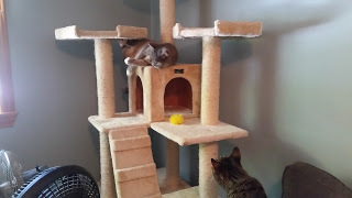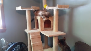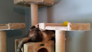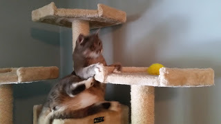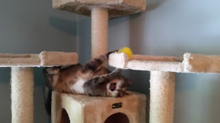 Now she can't fool me. I won't see if she tries to let a lie fly free. I may just pass some gas on her head. That will cause her dread. Do furry balls give you such glee? Oh that is a loaded question from me. Maybe you can play with them with Cass? Just don't hog the tower of my little rhyming ass.