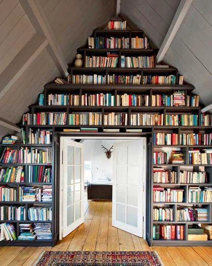 This image makes me happy. Books. Floor to ceiling. Taking up every spare inch of space. Not taken that seriously, but still (in my mind at least) precious and well loved. To me this looks like a happy home indeed. Are you a person that likes to have books all around or are you more like my dear DH and a bit more sleek and organized and just a smidge less clutter? Maybe a more formal library?