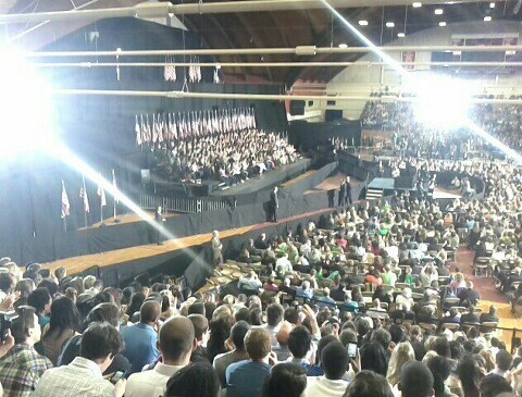 Well, he choose my DD’s college sports center as the venue to hold that speech. On Friday she was one of the many students to line up and score one of the hottest tickets in town. She and her friend were so excited when they called me screaming after getting their tickets that I was feeling giddy right along with them.