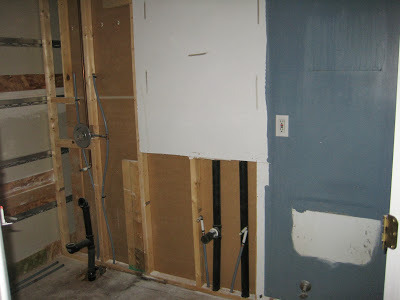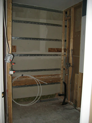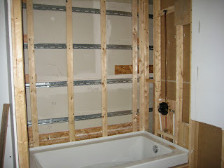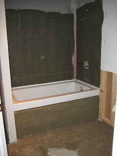 Additionally, the walls around the bathtub went up and received a water-proofing coating (the black stuff).